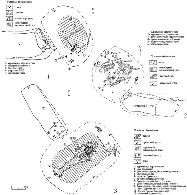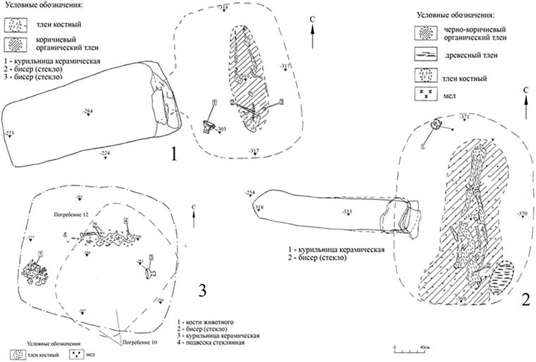 Рисунок 14 – Планы погребений кургана 4 могильника Кунаковский-2: 1 – погребение 8; 2 – погребение 11; 3 – погребение 12