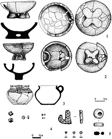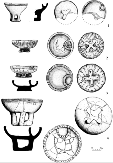 Курильницы по своему облику соответствуют традициям, известным для ритуальных чаш СувКК. В погребении 4, находившемся в центральной части кургана и имевшем катакомбную конструкцию с дромосом и каменным закладом, ритуальная чаша располагалась у черепа ребенка (кости ребенка очень плохой сохранности) [6, с. 39, рис. 110] (рис. 3: 1). Курильница представляет собой чашу на полом крестовидном поддоне, с отделением. Венчик не выделен. Внешняя поверхность черно-коричневая, с пятнами [6, с. 39, рис. 113] (табл. 1; рис. 4: 1). Кроме того, в погребении были найдены стеклянные (пастовые?) подвески с напаянными шариками и четырехрожковый бисер, шесть астрагалов и зубы мелкого рогатого скота [6, с. 39, рис. 117] (рис. 5: 1).