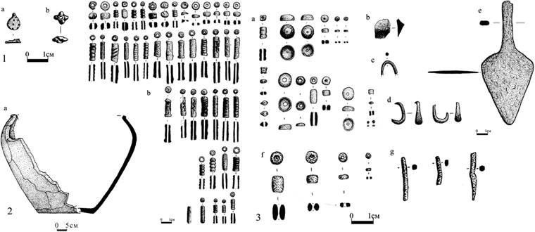 Рисунок 5 – Находки из погребений кургана 1 могильника Кунаковский-2: 1 – погребение 4 (а – подвески; b – бисер); 2 – погребение 6 (а – сосуд; b – бусы и пронизки (стекло, бронза, кость); 3 – погребение 7 (а – бусы (бронза, сердолик, кость); бисер; b – отщеп обсидиановый; с – проволока металлическая; d – подвеска бронзовая; е – нож бронзовый; f – бусы сердоликовые, бисер; g – проволока бронзовая); 1, 2b, , 3f – паста; – керамика; 2b, 3a, 3d, 3e, 3g – бронза; 3a, 3b, 3f – камень