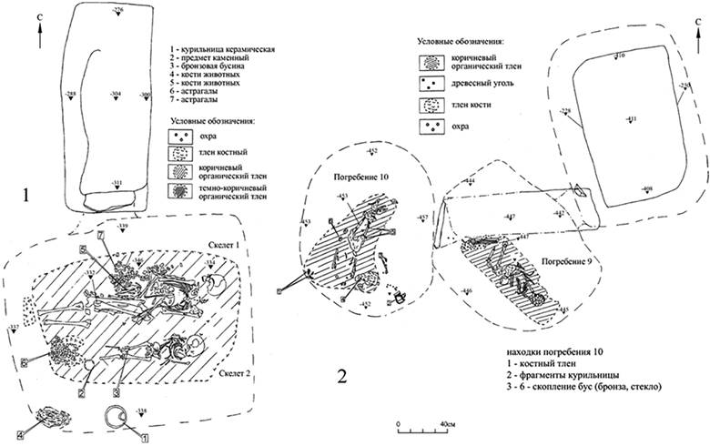 Рисунок 6 – Планы погребений кургана 1 могильника Кунаковский-2: 1 – погребение 8; 2 – погребение 10