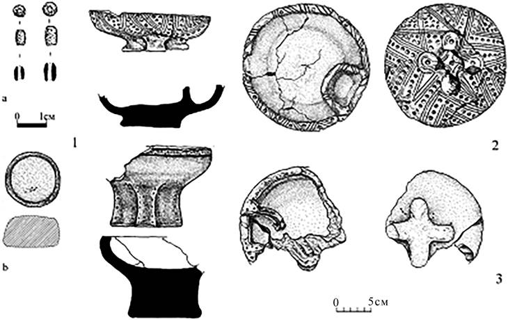 Рисунок 7 – Находки из погребений кургана 1 могильника Кунаковский-2: 1 – погребение 8 (а – бусина; b – наковаленка); 2 – курильница из погребения 8; 3 – курильница из погребения 10; – бронза, 1b – камень, 2, 3 – керамика