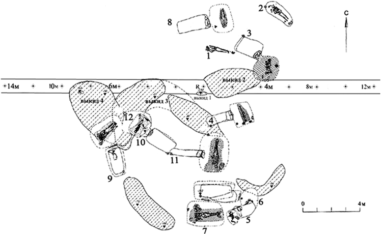 9. Figure 8 - Plan of mound 4 of the Kunakovsky-2 burial ground (the numbers on the plan indicate the numbers of the burials)