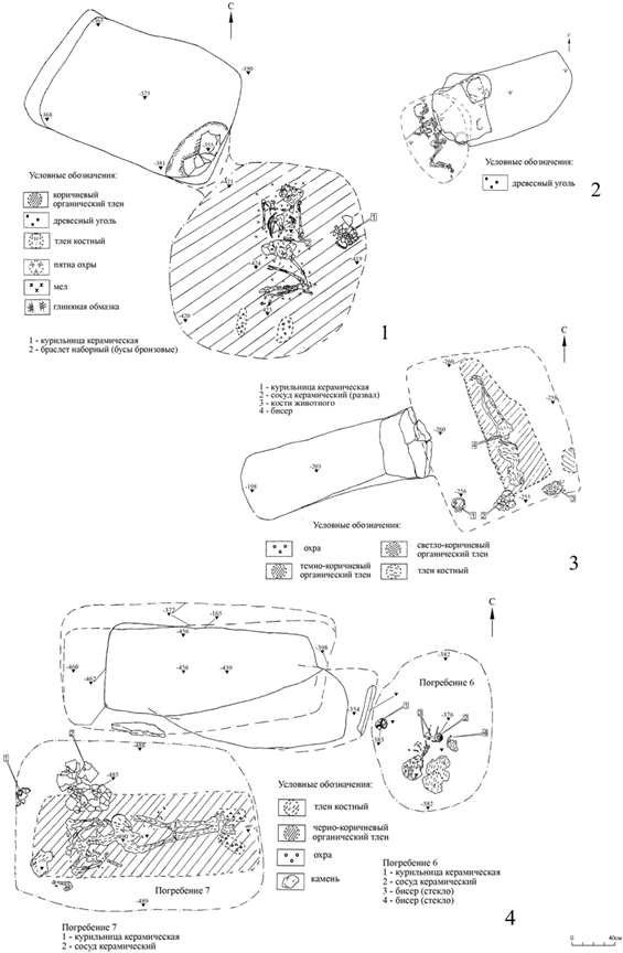 Рисунок 10 – Планы погребений кургана 4 могильника Кунаковский-2: 1 – погребение 3; 2 – погребение 5; 3 – погребение 4; 4 – погребения 6 и 7