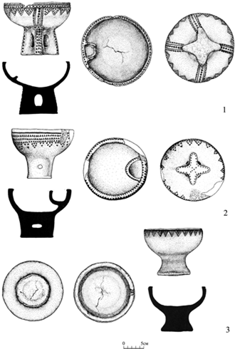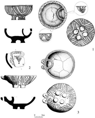 16. Figure 15 - Incense burners from mound 4 of the Kunakovsky-2 burial ground: 1 - burial 8; 2 - burial 11; 3 - burial 12; 1-3 - ceramics