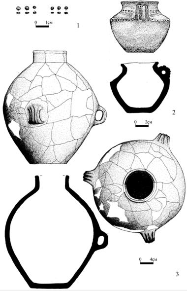 Рисунок 13 – Находки из погребений кургана 4 могильника Кунаковский-2: 12 – погребение 6 (1 – бисер; 2 – сосуд); 3 – сосуд из погребения 7; 1 – паста, 2, 3 – керамика