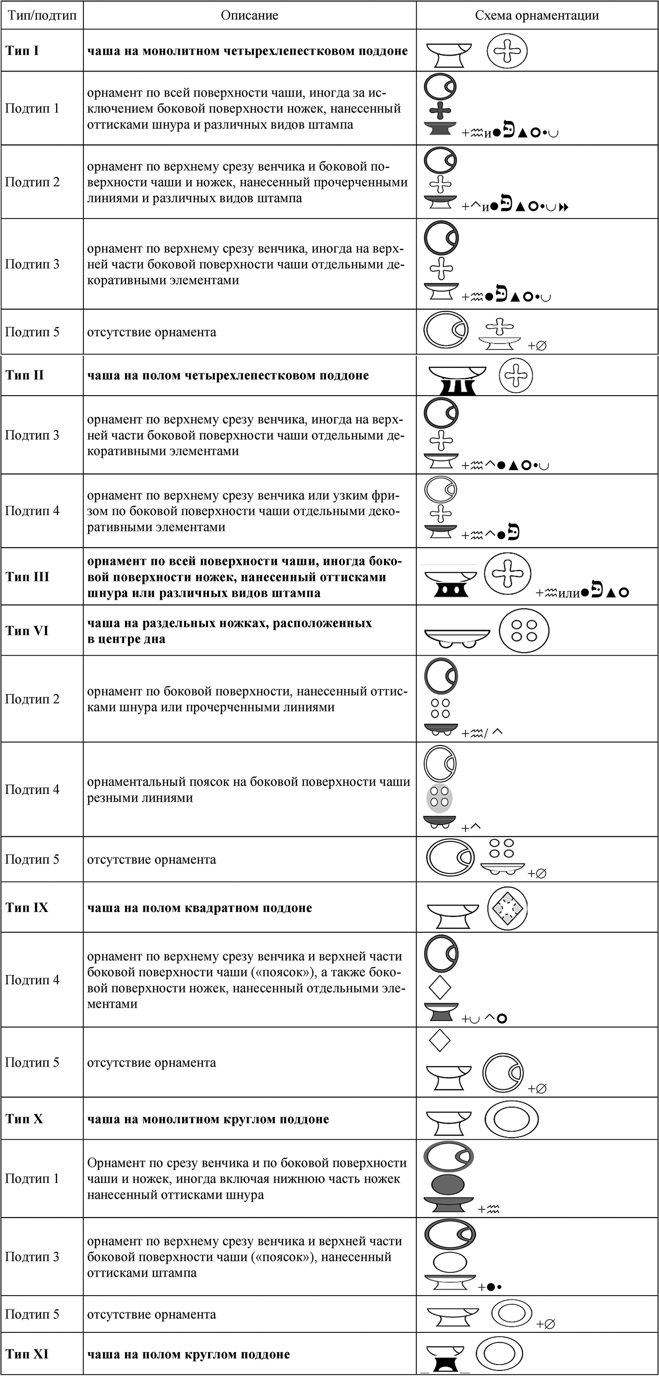 Примечание. » – шнур; á – прочерченный орнамент; l – круглый штамп; פּ – спиральный штамп; Ÿ – точечный орнамент; ▲ – треугольный штамп; È – ногтевые вдавления; 8 – зубчатый штамп.