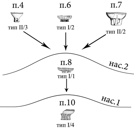 В кургане 1 в центре находилось два катакомбных погребения (9 и 10). С ними связаны фрагменты материкового выкида, зафиксированные на уровне погребенной почвы в южном и частично северном профиле центральной бровки (рис. 2). Вероятно, эти фрагменты представляли собой целую линзу, которая была нарушена при сооружении катакомбного погребения 3, впущенного в первую насыпь. Взаимное расположение камер этих погребений (рис. 1, 6: 2) позволяет предположить, что они были сооружены единовременно. Эта сложная двухкамерная катакомбная конструкция была основной для первоначальной насыпи. Здесь найдена курильница типа I/4. Дальнейшее строительство кургана связано с сооружением погребения 8, которое сопровождалось возведением второй насыпи, сместившей центр кургана к западу (рис. 1, 2). В полы этой насыпи были по кругу впущены погребения 4, 6, 7 и детское погребение 5 без курильницы. Характерно, что все эти стратиграфически не разделяемые погребения этого кургана содержали курильницы сходных типов (I, II), что подтверждает относительную синхронность совершения захоронений (рис. 16).