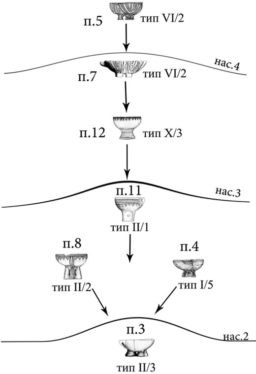 Стратиграфическая колонка погребений кургана 4, несмотря на неисследованную южную полу, выстраивается следующим образом. Вероятно, курган был полностью возведен в эпоху средней бронзы, но в несколько этапов, которые четко маркируются погребениями с курильницами разных типов. Первая насыпь была сравнительно небольшой: не более полуметра высотой и 5–6 м в диаметре. Она относится к погребению, от которого сохранился лишь небольшой фрагмент материкового выкида, лежавший на погребенной почве (рис. 8, 9). Возможно, основное захоронение было разрушено более поздними могилами. Затем было сооружено раннекатакомбное погребение 3, сопровождавшееся мощным материковым выкидом (рис. 8, 9). Возведенная над ним вторая насыпь существенно увеличила высоту и диаметр кургана. В погребении 3 найдена курильница без отделения типа II/3. В северную полу второй насыпи было впущено захоронение 8 с курильницей типа II/4, имеющей орнаментацию характерную только для суворовской катакомбной культуры. В южную часть этой же насыпи было впущено погребение 4, содержавшее ритуальную чашу типа I/5. Входная яма этого погребения была перекрыта мощным материковым выкидом, связанным со следующим этапом курганного строительства. Тогда были сооружены погребения 10 (детское) и 11 (взрослое, с курильницей типа II/1), над которыми была сделана третья насыпь, в результате чего центр кургана сместился к юго-юго-западу (рис. 8). Входные ямы этих погребений смыкались, что не позволило установить их хронологическую последовательность; сходство обряда, сопровождающего инвентаря, подстилки и мощность материкового выкида, связанного с ними, дает возможность предположить их одновременность. Впускным захоронением для этой насыпи, нарушившим камеру п. 10, стало п. 12 с ритуальной чашей типа Х/3. С самым поздним этапом строительства кургана связаны погребения 7, 6 и 5 с курильницами типов VI/2 и VI/1 (в п. 6 чаша представлена во фрагментах – тип не устанавливается), сгруппированные в южной части. Самым ранним из них является погребение 7 – возможно, оно было основным (наряду с п. 9) для четвертой насыпи. С этим погребением связан материковый выкид, перекрывший третью насыпь к востоку от захоронения. Глубина залегания этого выкида одинакова с двумя другими линзами, связанными с погребением 9 и также перекрывающими третью насыпь на ее западной и южной границах (рис. 8, 9). В четвертую насыпь было впущено погребение 6, обнаруженное по общему с погребением 7 аморфному пятну заполнения входной ямы. Заполнение ям двух погребений отличались друг от друга, что свидетельствует об их разновременности. Доказательством более позднего возраста погребения 6 является то обстоятельство, что закладной камень был примазан глиной прямо к черноземному заполнению погребения 7 (рис. 10: 4). Самым последним катакомбным погребением с курильницей стало погребение 5, впущенное в южную полу четвертой насыпи и перекрывшее камеру погребения 6 (рис. 8). В результате выстраивается показательная колонка типов ритуальных чаш (рис. 17): первым появляется тип II, который используется довольно долго, дополняемый типом I, причем варианты орнаментации меняются (подтипы 5, 1); поздние этапы функционирования курганной насыпи связаны с типами Х и VI.