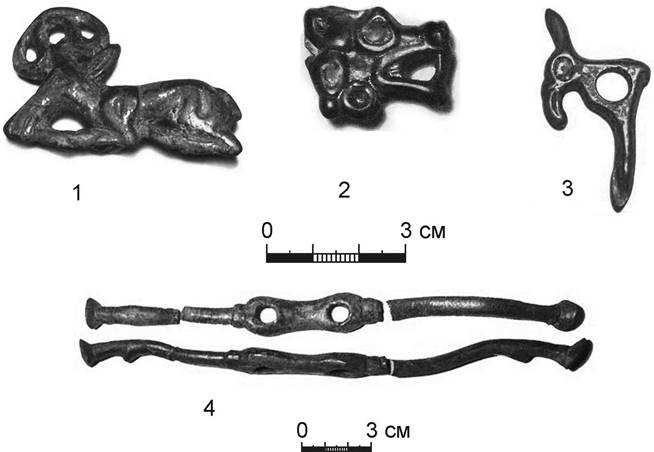 Рисунок 1 – Бронзовые принадлежности снаряжения коня, обнаруженные около кургана 21 могильника Филипповка I: 1–2 – бляшки, 3 – налобник, 4 – псалий (рисунки по [5, с. 177: № 2154–2157]