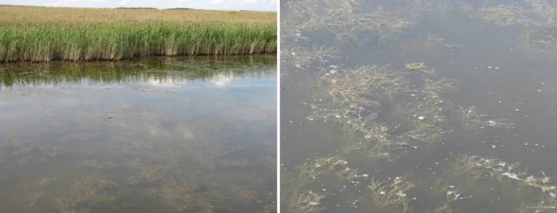 - Изредка встречающиеся – 12% видов (в 11–25% водоемах): Cladophora fracta, Rhizoclonium hieroglyphicum, Ceratophyllum demersum, Persicaria amphibia, Elodea canadensis, Bolboschoenus planiculmis, Typha angustifolia, Alisma plantago-aquatica, Potamogeton friesii, Eleocharis palustris, Scirpus lacustris, Scolochloa festucacea.