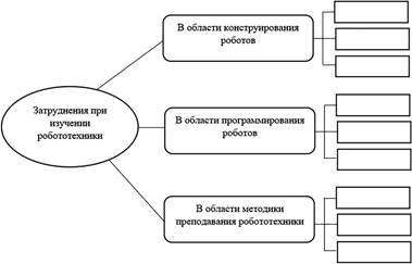 Для оценки уровня развития рефлексивных умений в данной области на заключительном занятии студентам предлагается заполнить ментальную карту [8, с. 31], в которой показать основные затруднения, которые возникли у них в процессе изучения робототехники в вузе. Кроме того, на ментальной карте необходимо указать, в чем сложность преподавания робототехники (см. рис. 2).