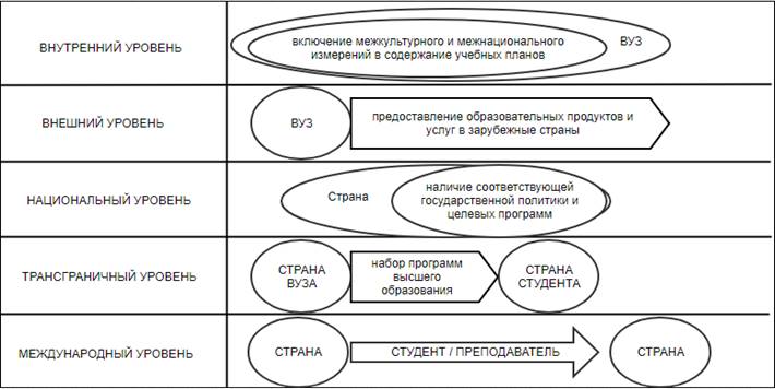 Под внутренней интернационализацией понимается включение межкультурного и межнационального измерений в содержание учебных планов, процессы преподавания и обучения, а также во внеаудиторную работу со студентами [15, с. 166].