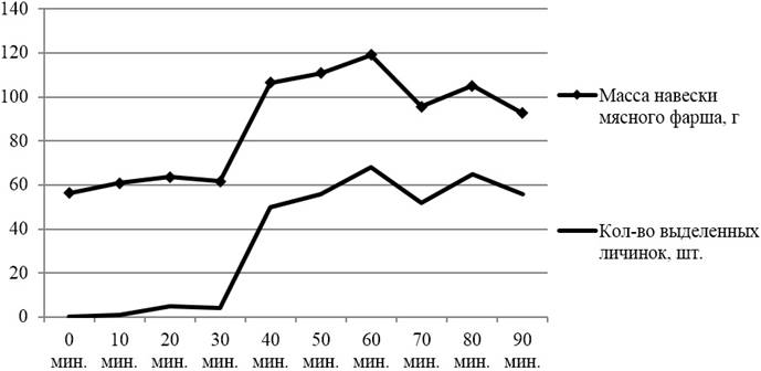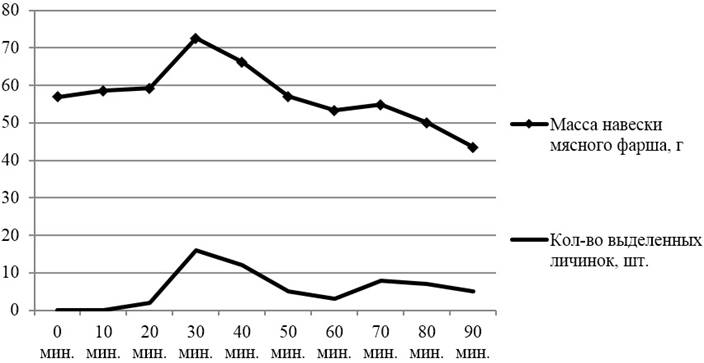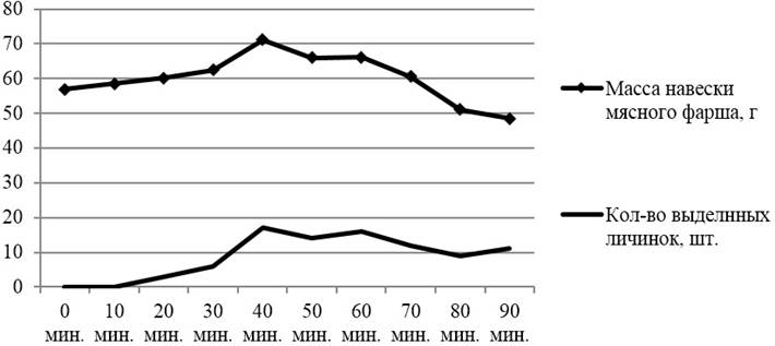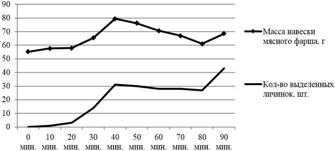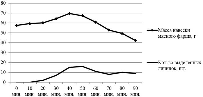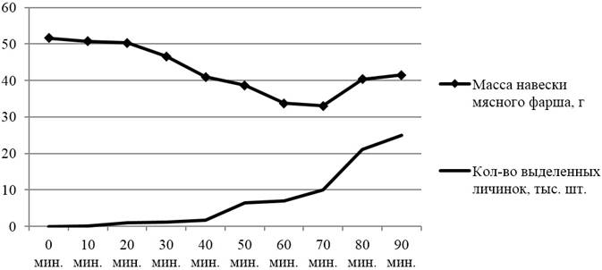 Рисунок 6 – Динамика изменения навески фарша (мышцы головы, шеи, межреберные, мышцы передней и задней конечностей) и интенсивность выделения личинок T. spiralis трихинелл (лабораторный изолят) из мышечной ткани тушки лабораторной крысы (ИИ = 138 лич./г диафрагмы)