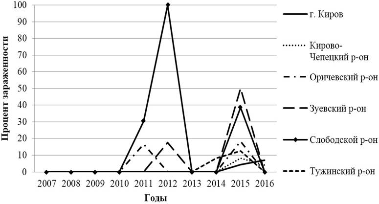 В Оричевском, Зуевском и Слободском районах пики зараженности появляются раньше, чем в других районах (рис. 2). Появление сибирской изоформы может объясняться тем, что эти районы расположены восточнее всех изучаемых районов.