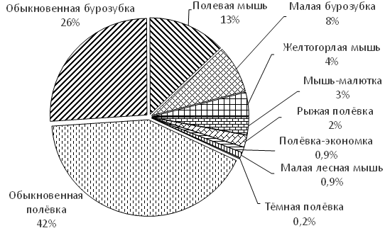По результатам учетов при помощи ловушек Геро доминантом на исследованных участках является обыкновенная полевка – 47%, на втором месте рыжая полевка – 39%, затем малая лесная мышь – 8%, а желтогорлая мышь и общественная полевка (Microtus socialis Pall.) составляют 3% соответственно. Процент самок (55,9%) выше, чем процент самцов (44,1%). Среди половозрелых и беременных самок доминируют рыжая и обыкновенная полевки. Среди половозрелых самцов также доминируют рыжие полевки, причем неполовозрелых особей не встречено вообще. Большую долю неполовозрелых самцов составляют обыкновенные полевки.