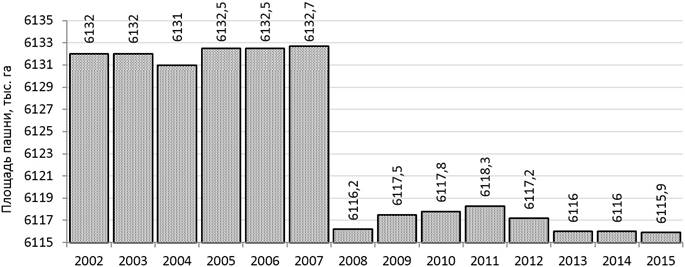 Рисунок 3 – Динамика площади пашни в Оренбургской области за период с 2002 по 2015 гг. [6]