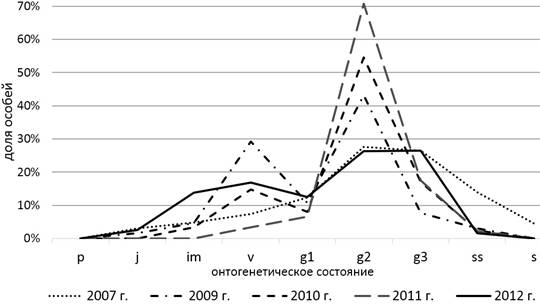 Исследования ЦП M. cancellata, проведенные в течение нескольких сезонов, позволили установить, что на онтогенетическую структуру ЦП влияют эколого-фитоценотические условия среды и антропогенная нагрузка. Кроме того, выявлена динамика онтогенетической структуры, которая является флуктуационной. Это характерно для большинства видов-полукустарничков [22] и отмечалось для видов самарской флоры [5–9]. Динамика ЦП на стационарном участке Серноводского шихана представлена на рис. 1.