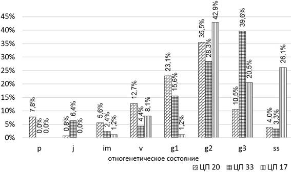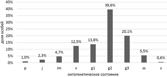 Демографическая структура ЦП определялись согласно традиционным методикам [18–24]. При определении онтогенетической структуры ЦП учитывались проростки (p), ювенильные (j), имматурные (im), виргинильные (v), молодые генеративные (g1), средние генеративные (g2), старые генеративные (g3), субсенильные (ss), сенильные (s) онтогенетические состояния. На основании полученных оригинальных данных были построены онтогенетические спектры конкретных ЦП и базовый возрастной спектр.