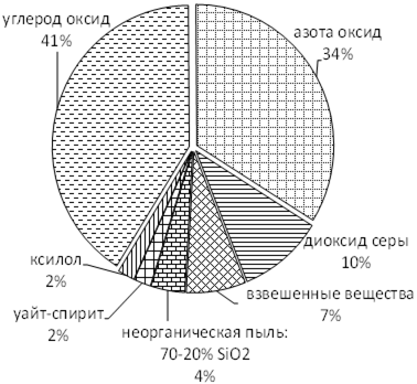 Спектр выбрасываемых веществ от предприятия представлен 38 компонентами, среди них к 1 классу опасности относятся бенз(а)пирен и хром шестивалентный; ко 2 классу – сажа, оксиды азота и углерода, марганец и его соединения, серная кислота, сероводород, фтористые газообразные соединения, бензол; к 3 классу – диоксиды азота и серы, вольфрамовый ангидрид, ксилол, толуол, взвешенные вещества, керосин, неорганическая пыль; к 4 классу – углерод, этанол, бензин и другие. Наибольшие объемы выбросов приходятся на такие загрязняющие вещества, как оксид углерода (около 40%), оксиды азота (35%), диоксид серы (10%), взвешенные вещества (7%), неорганическая пыль: 70–20% SiO₂ (5%) (рис. 2).