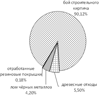 Максимум объема отходов на предприятии приходится на бой строительного кирпича (4900 т/год – 52%), несортированные древесные отходы (299 т/год – 4%) и лом черных металлов (228,42 т/год – 3%), отработанные резиновые покрышки (10 т/год) (рис. 3) [11, с. 4].