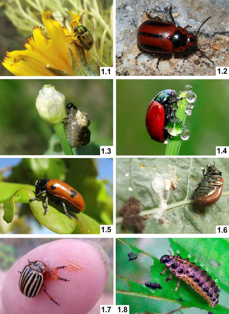Рисунок 1 – Пассивная защита жуков-листоедов: 1.1 – жук Cryptocephalus laetus, сидящий на цветке кульбабы осенней (фото О.В. Павловой); 1.2 – жук Entomoscelis adonidis – на камне (фото Д.В. Варенова); 1.3 – личинка трещалки затаилась на цветоносе лука гусиного (фото В.Н. Макаренкова); 1.4 – жук Chrysomela populi пережидает дождь на побеге хвоща полевого (фото В.Н. Макаренкова); 1.5 – жук Clytra quadripunctata затаился (поджав усики) на листе дуба обыкновенного (фото В.Н. Макаренкова); 1.6 – танатоз жука Chrysolina sp. на листе щавеля (фото О.В. Павловой); 1.7 – выделение гемолимфы колорадским жуком (фото О.В. Павловой); 1.8 – личинка Chrysomela sp. с каплями отпугивающего экскрета на железах-бородавках (фото В.Н. Макаренкова)
