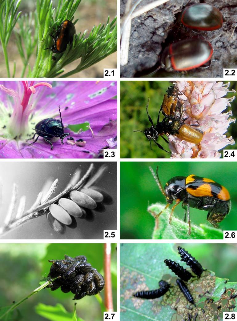Рисунок 2 – Активная защита жуков-листоедов: 2.1 – имаго Chrysolina marginata прячется в междоузлие побега матрикарии непахучей (фото О.В. Павловой); 2.2 – жуки Chrysolina limbata прячутся в трещинах почвы (фото О.В. Павловой); 2.3 – послебрачная чистка самца Cryptocephalus violaceus на цветке герани луговой (фото В.Н. Макаренкова); 2.4 – драка самцов-конкурентов Labidostomis humeralis на соцветии заразихи обыкновенной (фото В.Н. Макаренкова); 2.5 – кладка Chrysolina graminis под листом полыни высокой (фото С.И. Павлова); 2.6 – лепка яйцевого чехлика самкой Cryptocephalus octacosmus, сидящей на крапиве жгучей (фото В.Н. Макаренкова); 2.7 – группа личинок 2-го возраста трещалок, сидящих на побеге кипрея болотного (фото О.В. Павловой); 2.8 – подергивание открытоживущих личинок листоедов, кормящихся на крестовнике (фото С.И. Павлова)
