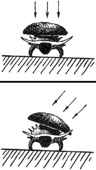 Прятание в тень, искусственно создаваемую самой личинкой (рис. 3) в результате разворачивания щитка перпендикулярно направлению падения солнечных лучей.