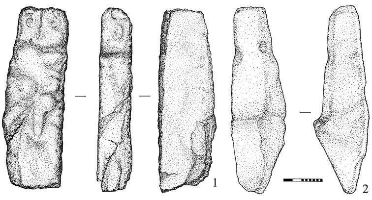 Рисунок 1 – Ашутасты-2. Статуарные памятники. 1 – каменное изваяние; 2 – антропоморфная стела