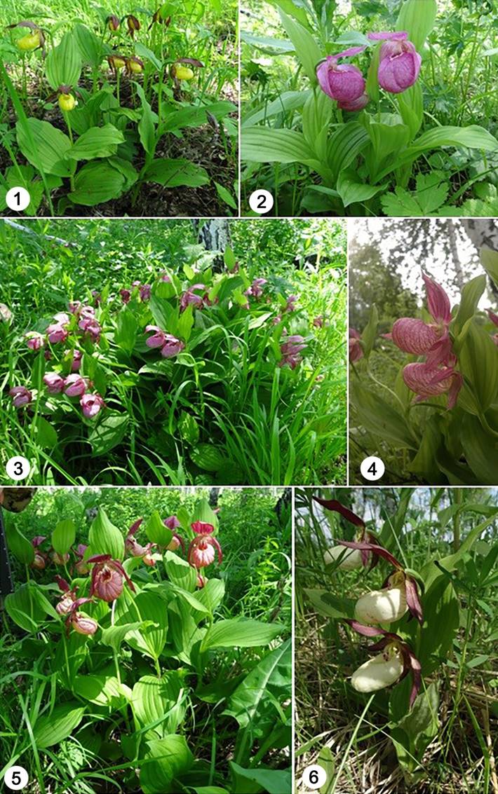 Рисунок 1 – 1 – Cypripedium calceolus; 2 – Cypripedium macranthon; 3–6 – Cypripedium × ventricosum
