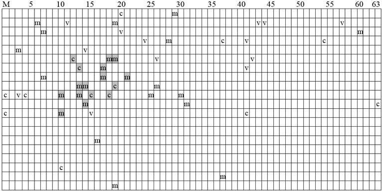 Рисунок 2 – Расположение генеративных особей C. calceolus (с), C. macranthon (m) и C. × ventricosum (v) на учетной площадке