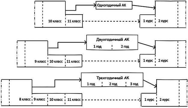 Первый опыт создания и функционирования интегрированной системы непрерывного и дифференцированного (по способностям) образования «Школа - вуз» в гомогенных группах приобретался при отработке структуры так называемого одногодичного АК. Методологическим ядром концепции одногодичного АК является совмещение по времени и интеграция по содержанию образовательной программы 11-го класса средней общеобразовательной школы (лицея, гимназии) и образовательно-профессиональной программы 1-го курса технического университета (по конкретному предметному направлению).