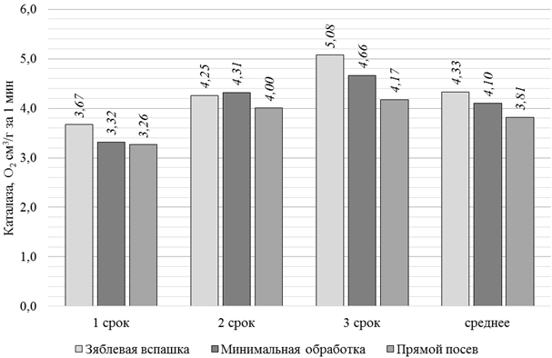 Каталазная активность практически не зависела от изучаемых факторов. В среднем за годы исследований наиболее высокая активность каталазы наблюдалась в 3-й срок наблюдения, а наименьшая в 1-й срок определения. Весной каталазная активность почвы на вариантах опытного поля составила в среднем: по вспашке – 3,67, дискованию – 3,32 и прямом посеве – 3,26 О₂ см³/г за 1 мин. Разница между вариантами составила 11%.