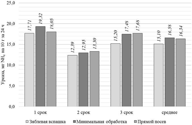 В середине вегетационного период уреазная активность снижается по всем вариантам обработки. К 3-му сроку отбора отмечается увеличение уреазной активности почвы. В конце вегетационного периода активность этого фермента максимальна на варианте прямого посева и достигает 17,68 мг NH₄ на 10 г за 24 ч. Средняя динамика уреазной активности в зависимости от основной обработки почвы представлена на рисунке 2.