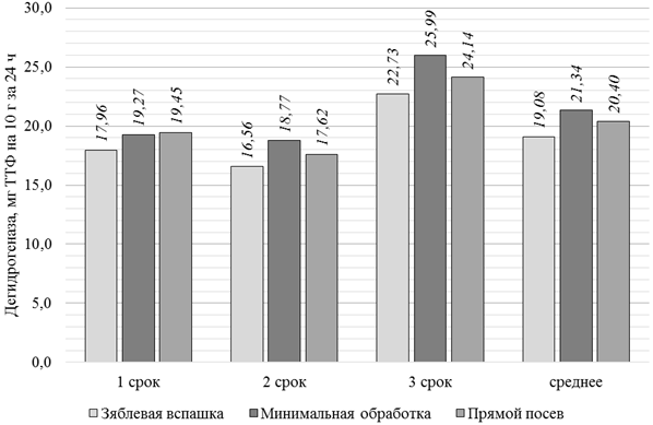 Анализ активности фермента пахотного горизонта почвы показал положительное влияние минимизации обработки почвы на активность дегидрогеназы. Более высокая активность дегидрогеназы отмечается на варианте с дискованием, независимо от выращиваемой культуры. В конце вегетационного периода активность фермента составляет 22,73 мг ТТФ на 10 г за 24 ч. на варианте с вспашкой, 24,14 на варианте с прямым посевом и 25,99 мг ТТФ на 10 г за 24 ч. на варианте с дискованием.