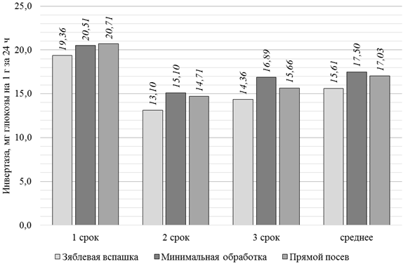 Максимум активности инвертазы наблюдался весной и осенью, а минимум в середине вегетационного периода. Значения активности инвертазы в весенний период находились в интервале 19,36–20,71 мг глюкозы на 1 г за 24 ч. Летом происходило понижение ее уровня в 1,4 раза до 13,10–15,10 мг глюкозы на 1 г за 24 ч. Средняя динамика инвертазной активности в зависимости от основной обработки почвы представлена на рисунке 4.