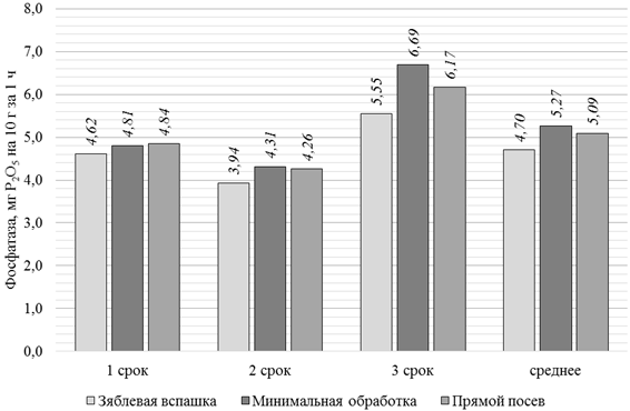 Интенсивность фосфатазной активности в летний период снижалась до 3,94–4,31 мг P₂O₅ на 10 г за 1 ч. В конце вегетационного периода активность фермента составляет 5,55 мг P₂O₅ на 10 г за 1 ч. на варианте с зяблевой вспашкой, 6,17 на варианте с прямым посевом и 6,69 мг P₂O₅ на 10 г за 1 ч. на варианте с дискованием.