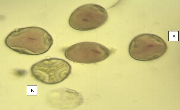 Рисунок 3 – Пыльца липы мелколистной, 10 × 40; А – фертильная пыльца, Б – стерильная пыльца