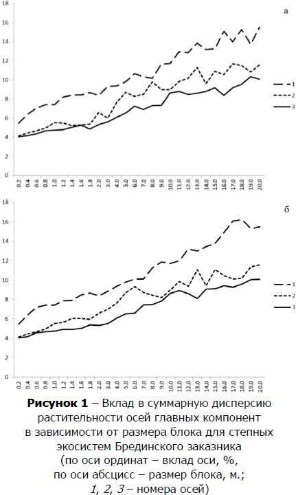 Оценка мозаичности степных целинок Брединского заказника (рис. 1) показала, что характер увеличения вклада осей главных компонент в суммарную дисперсию для обоих вариантов анализа очень близок.