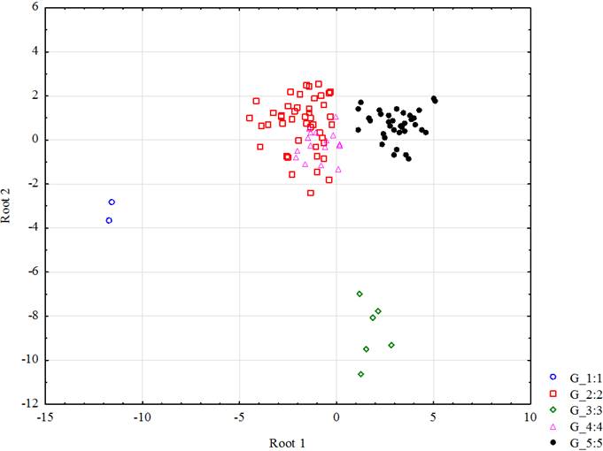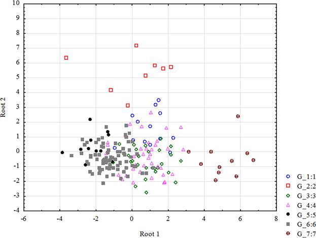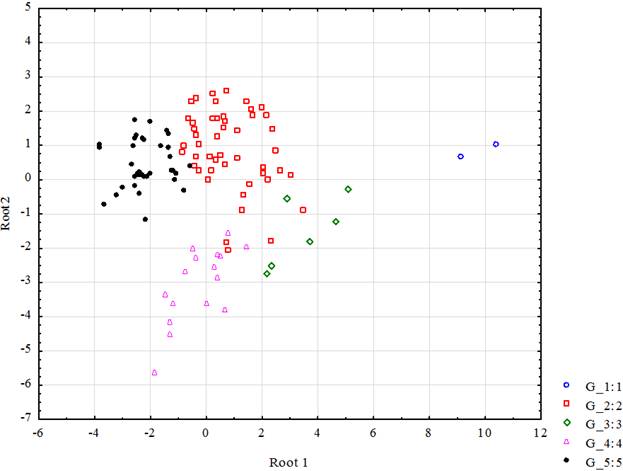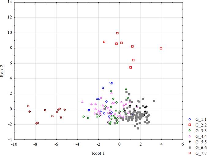 Рисунок 4 – Ординация микрофитоценохор (6,0 м) в эколого-ценотическом пространстве (Root1 и Root2 – дискриминантные функции)