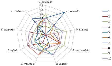 Для остальных изученных на предмет встречаемости в р. Белой гидробионтов – S. pallipes, V. piscinalis (район ж/д станции «Шушпа»), B. leachii (ниже г. Мелеуз), B. troschelii (выше г. Салават), B. tricolor, H. interpunctatus, A. soror, V. macrostoma (ниже г. Ишимбай), X. apicalis (выше г. Стерлитамак), A. soror, P. perfoliatus (ниже г. Стерлитамак), N. pictetii, S. aestivalis, S. pallipes (ниже п. Прибельский) в зависимости от содержания в воде химических веществ и их соединений коэффициент детерминации находился в диапазоне R² = 0,53–0,48, что, очевидно, связано с влиянием неучтённых факторов.