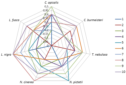 Изучение динамики постоянства личинок веснянок на биотопах верхнего и среднего течений р. Белой с 2005 по 2016 годы показало, что относительно постоянна лишь личинка L. nigra, что свидетельствует об адаптации этого вида к разным экологическим условиям. Встречаемость личинок C. apicalis, T. nebulosa, N. pictetii, N. cinerea, L. fusca и S. burmeisteri динамична по годам исследований (рис. 2).