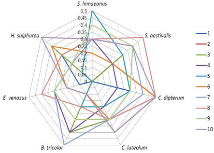 Так, при повышении содержания меди увеличивалась встречаемость V. piscinalis (р-н ж/д станции «Шушпа»), фенолов – B. troschelii (ниже г. Мелеуз) и P. bipunctata (р-н ДО «Арский камень» и ниже г. Ишимбай), соединений марганца – B. troschelii (выше г. Салавата) и V. macrostoma, личинок S. pallipes (район ж/д станции «Шушпа»), C. apicalis и B. tricolor и H. interpunctatus (ниже г. Ишимбай), соединений железа – C. burmeisteri и C. apicalis (ниже г. Ишимбай и выше г. Стерлитамака, соответственно), S. aestivalis (выше г. Стерлитамака), A. soror (ниже г. Ишимбай) и C. villosa (выше г. Стерлитамака), на P. perfoliatus, N. marina и L. minor (ниже г. Стерлитамака), нефтепродуктов – C. luteolum (ниже п. Прибельский), S. pallipes (ниже п. Прибельский), B. umbellatus, C. demersum (р-н ДО «Арский камень») и P. lucens (ниже г. Ишимбай).
