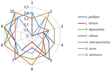 P. bipunctata | Н/п | –0,74 | Y = –0,05x + 0,48 | 0,56 | 11, 81 | 5,12 | 23,2 | |||||||
