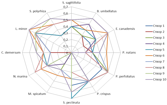Как уже было выше отмечено, постоянство видов ВВР, а особенно E. canadensis и S. pectinate, в р. Белой обладает значительной динамикой. Такие виды ВВР, как S. sagittifolia, B. umbellatus, P. natans, P. perfoliatus, P. crispus, S. pectinalis, C. demersum и S. polyrhiza, можно охарактеризовать с позиций добавочных видов в реке (рис. 6). Такой вид, как M. spicatum, на ряде створов можно охарактеризовать с позиций добавочного и случайного вида, что также, по-видимому, связано с экологическими условиями на изученных створах (грунт, скорость течения, химическое загрязнение и т.п.).