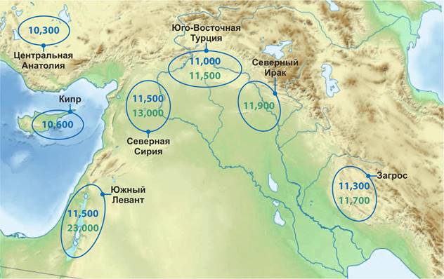 Принципиально, что раннеголоценовый глобальный теплый тренд не был монотонным, а нарушался рядом кратковременных похолоданий, и эти колебания температур усугубляют проблему влияния климата на социально-экономические процессы эпохи неолитизации на Ближнем Востоке [9, с. 26–27; 10]. Как обобщают Ю.Е. Берёзкин [11, с. 20] и О. Бар-Йозеф [12, p. 305, p. 307–309, fig. 19: 2], в период после последнего ледникового максимума (25/24000–19/18000 лет назад, здесь и далее даты калиброванные), которому в Передней Азии соответствует крайняя аридизация, в жизни мобильных охотников и собирателей региона наметились изменения (кебарийская и небекийская культуры). С началом резкого глобального потепления и, соответственно, увеличения влажности в южных засушливых областях начался быстрый культурный прогресс, связанный с переходом к специализированному собирательству зерновых и бобовых (ранний Натуф, примерно 15/14500–13500 лет назад). Пережив ухудшение условий в период позднего дриаса (12800–11700 лет назад; поздний Натуф – примерно 13500–11700 лет назад), люди воспользовались устойчивым увлажнением эпохи раннего голоцена и от специализированного собирательства перешли к настоящему земледелию (докерамический неолит А, примерно 11700–10500 лет назад), а в VIII тыс. до н.э. (средний докерамический неолит Б; весь PPNB – примерно 10500–8200 лет назад) – и к скотоводству. При этом стоит иметь в виду, что переход к сельскому хозяйству осуществлялся на протяжении нескольких тысячелетий в различных частях Плодородного полумесяца не только разными путями (с доместикацией различных видов растений и животных), но и не всегда синхронно и зачастую далеко не последовательно, о чем говорят результаты комплексных исследований последних десятилетий.