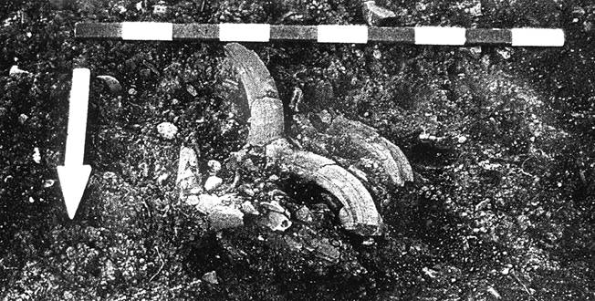 Рисунок 2 – Три бараньих черепа, уложенных в ряд, на «центральной площади» Халлан Чеми (по: [31, fig. 16])