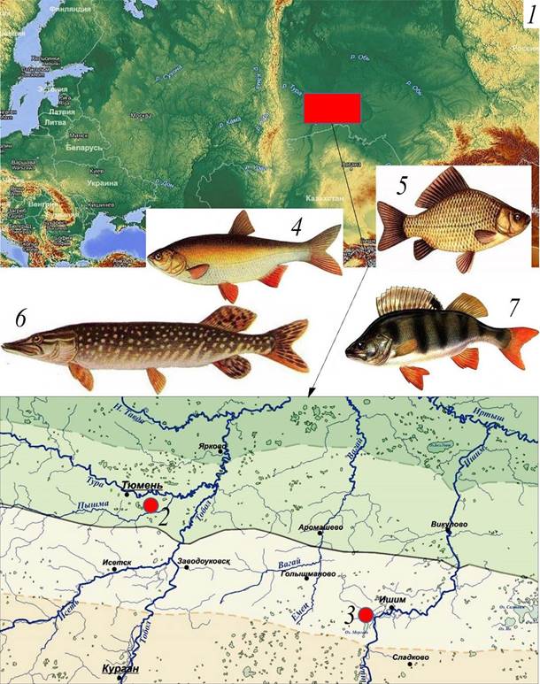 Рисунок 1 – 1 – Расположение Тоболо-Ишимского междуречья; 2 – система Андреевских озер; 3 – Мергеньский микрорайон; виды рыбы, добываемые в неолитическое время: 4 – язь, 5 – карась, 6 – щука, 7 – окунь