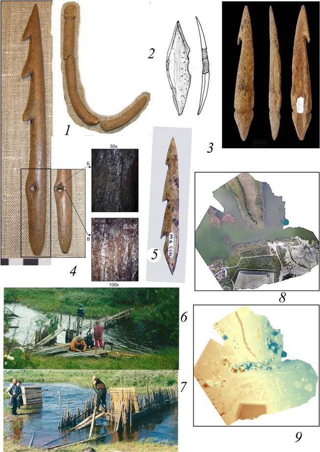 Рисунок 2 – Костяной инвентарь поселения Мергень 6. 1 – крюк из рога; 2 – «жерлица»; 3–5 – острога и гарпуны. 6, 7 – сооружение запора (верховья р. Казым); 8, 9 – ортофотопланы южной части Большого Андреевского острова (по О.С. Сизову)