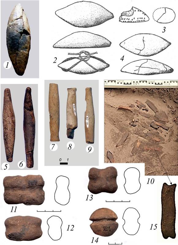 Первая классификация глиняных грузил была сделана М.Ф. Косаревым [8]. К переходному времени от неолита к раннему металлу им отнесены широко встречающиеся на памятниках Притоболья изделия биконической, сигаровидной форм и с раздвоенными («рожковидной» формы) концами (рис. 3: 1–9, 15). Глиняные грузила иногда скоплениями до 45 экз. находят в жилищах и на поселениях, значительное количество их обломков обнаружено по побережью озер, в частности Андреевской озерной системы. Периодизацию глиняных грузил начальных этапов раннего металла предложил Е.Н. Волков [9, с. 6], добавивший еще один тип изделий – стержневидной формы, в некоторых случаях – подквадратной формы в сечении. На наш взгляд, выделенные Е.Н. Волковым грузила наиболее близки к изделиям в виде стержней округлой в сечении формы с небольшим утолщением посередине и, вероятно, их прообразам – биконическим слегка приплюснутым грузилам. В последнее время предлагается развитие переходных от неолита к раннему металлу комплексов в такой последовательности: шапкульские, байрыкские и андреевские [10; 11]. Учитывая это, периодизацию глиняных грузил Нижнего Притоболья, предложенную М.Ф. Косаревым, следует считать более предпочтительной. Правда, грузила с раздвоенными концами (рожковидные) – самые поздние, в большинстве случаев они встречаются в комплексах металлоносной ташковской [12; 13] и коптяковской культур [14], сформировавшихся, как нам представляется, на основе местных комплексов гребенчато-ямочной и петровской и/или алакульской орнаментальных традиций. В жилище на поселении Чепкуль 5 вместе с коптяковской посудой встречено скопление грузил с раздвоенными концами, среди них глиняный диск с отверстием, а вне скопления – грузило подквадратной формы с одним перехватом (рис. 3: 10) [15]. Рассматриваемые глиняные грузила выходят за пределы Тоболо-Ишимья и встречаются на сопредельных западных и северо-западных территориях горно-лесного Зауралья и бассейна р. Конды в энеолитических комплексах, близких по материалам к лесостепным [16; 17].