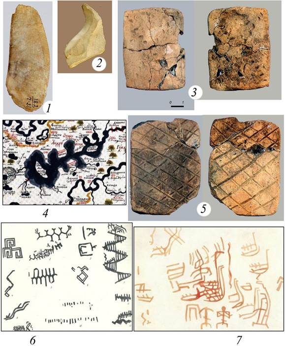 Рисунок 4 – Шлифованные ножи. 1 – Чепкуль 21; 2 – Велижаны 2; 4 – фрагмент карты системы Андреевских озер С.У. Ремезова 1700 г.; 3, 5 – «глиняные таблички» с поселения Серебрянка 1; 6, 7 – фрагменты писаниц Урала